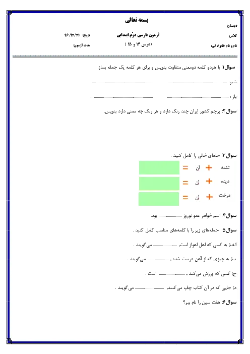 نمونه سوال امتحانی درس فارسی درس 14 و 15 پایه دوم دبستان همراه با پاسخنامه تشریحی