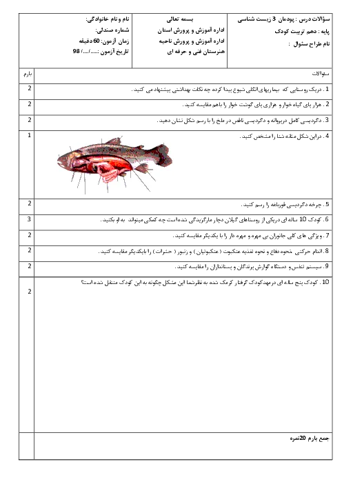 نمونه سوال امتحانی پودمان سوم زیست شناسی فصل 3: جانوران پایه دهم همراه با پاسخنامه تشریحی