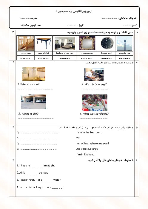 نمونه سوال امتحانی انگلیسی Lesson 6: My House پایه هفتم