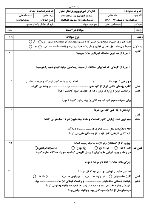 نمونه سوال امتحانی ترم دوم خرداد 1397 درس مطالعات اجتماعی پایه هفتم دبیرستان همراه با پاسخنامه تشریحی