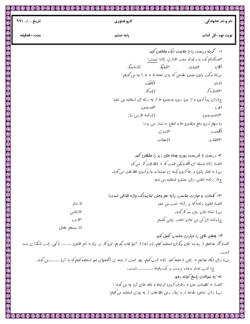 نمونه سوال امتحانی ترم دوم اردیبهشت 97 درس کار و فناوری پایه ششم دبستان