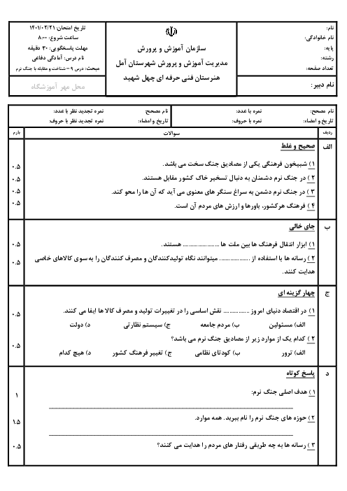 آزمون کلاسی آمادگی دفاعی دوازدهم هنرستان چهل شهید | درس 9: شناخت و مقابله با جنگ نرم