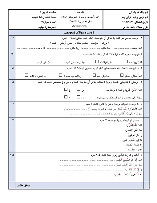 سوال استاندارد قران نهم نوبت اول منطبق با تغییرات کتاب درسی و بارم بندی جدید وسوالات متنوع صحیح وغلط کامل کردنی معانی آیات مفهومی و تشریحی