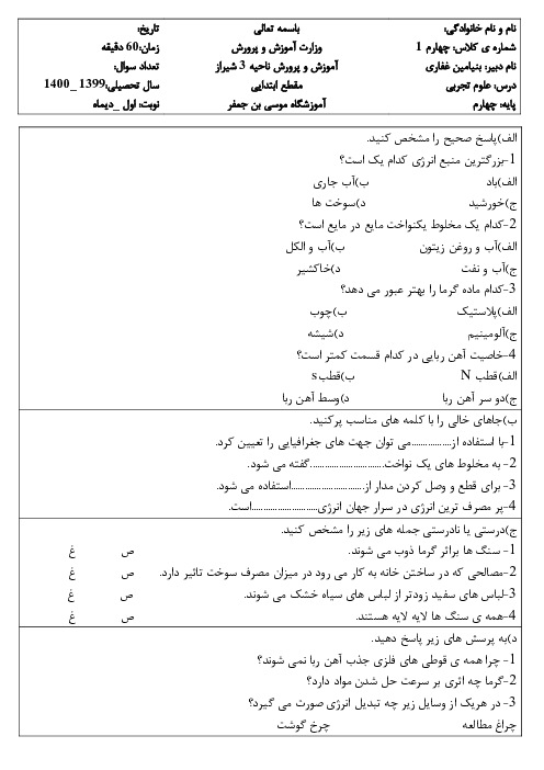 آزمون نوبت اول علوم تجربی چهارم دبستان موسی بن جعفر | دی 1399
