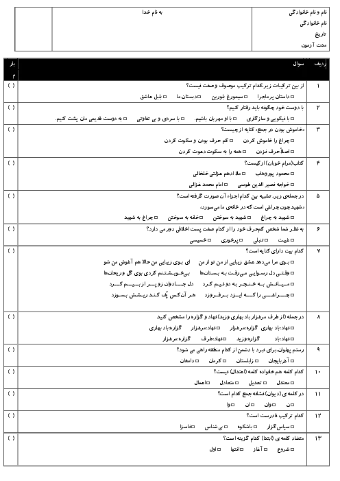 نمونه سوال امتحانی مستمر فارسی درس 1 تا 8 پایه ششم دبستان