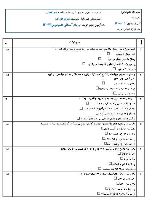 آزمون چهار گزینه ای درس 12 و 13 پیام آسمانی هفتم
