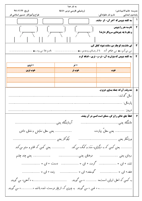 آزمون مداد کاغذی فارسی کلاس دوم دبستان خاتم الانبیاء | درس 10 تا 15