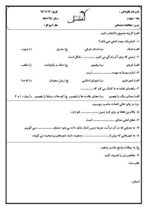 آزمون میان نوبت اول مطالعات اجتماعی چهارم دبستان تفضلی | درس 1 تا 6