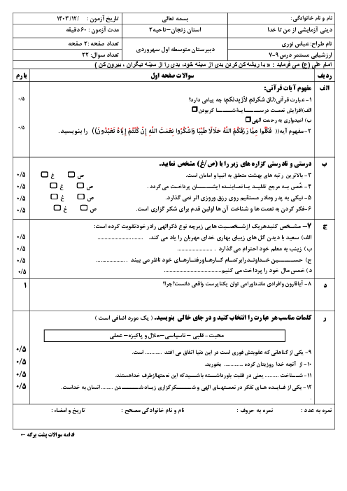 نمونه سوال امتحان درس 7 تا 9 کتاب آزمایشی تربیت دینی (از من تا خدا)