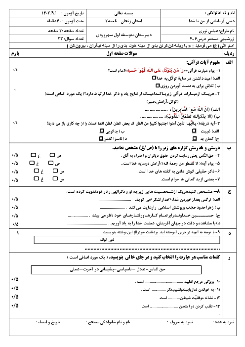 نمونه سوال امتحان ارزشیابی مستمر درس 4 تا 6 کتاب آزمایشی تربیت دینی (از من تا خدا) همراه با پاسخنامه تشریحی