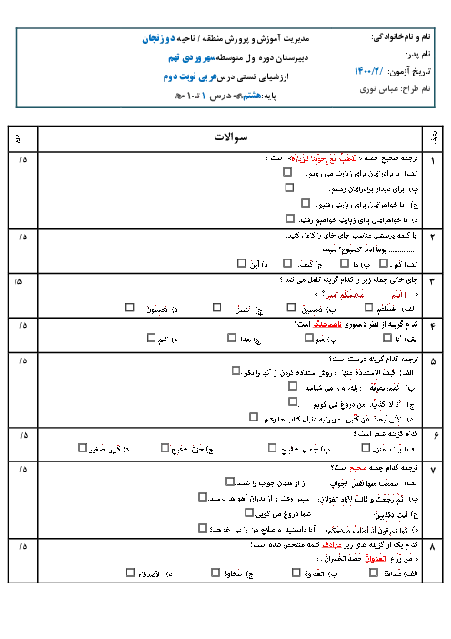 نمونه سوال امتحانی تستی ترم دوم عربی درس 1 تا 10 پایه هشتم همراه با پاسخنامه کلیدی