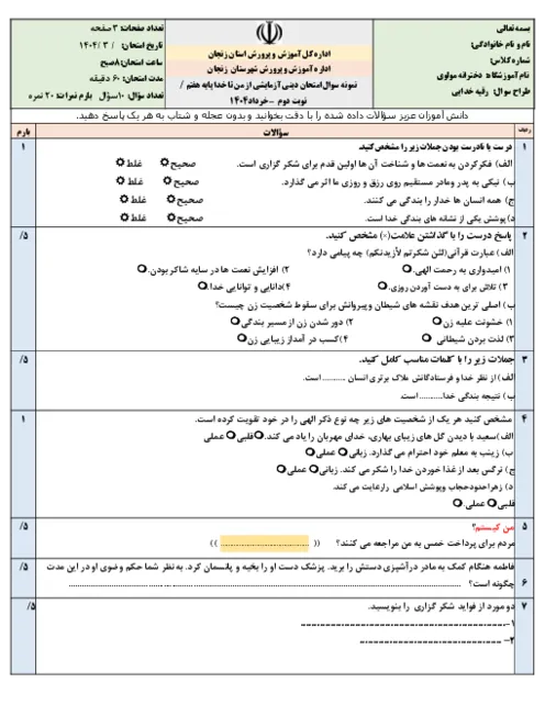 نمونه سوال امتحان نوبت دوم دینی (از من تا خدا) پایه هفتم همراه با پاسخنامه تشریحی