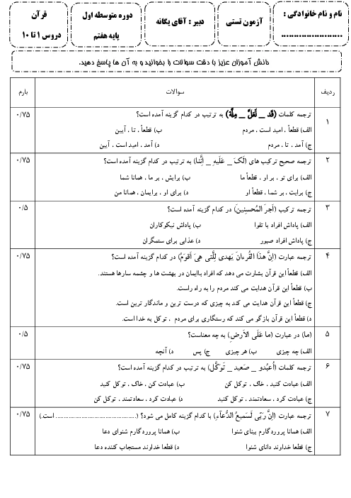 نمونه سوال امتحانی تستی قرآن درس 1 تا 10 پایه هفتم همراه با پاسخنامه کلیدی