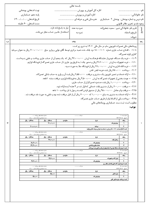 نمونه سوال امتحانی پودمان 2: حسابداری دریافتها حسابداری وجوه نقد و تحریر دفاتر قانونی همراه با پاسخنامه تشریحی