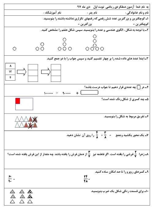نمونه سوال امتحانی دوره ای درس ریاضی فصل 1 تا 3 پایه چهارم دبستان