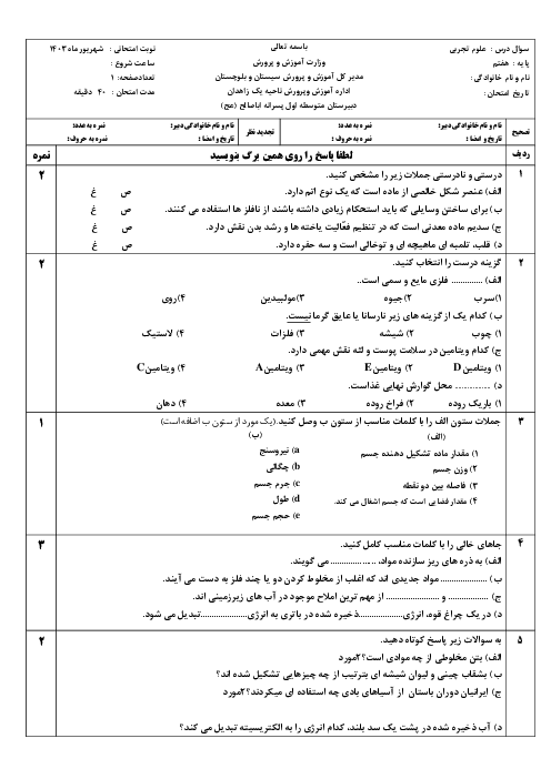 آزمون نوبت دوم شهریور 1402 درس علوم تجربی پایهی هفتم همراه با پاسخنامه تشریحی
