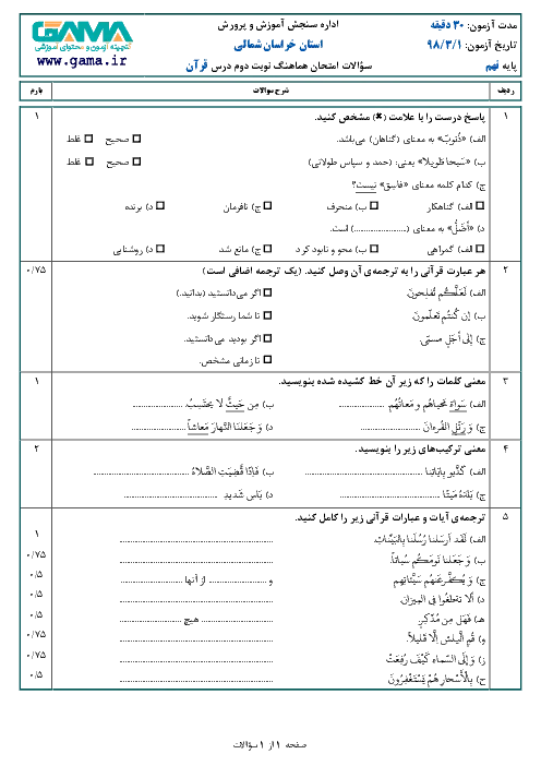 امتحان هماهنگ استانی نوبت دوم قرآن پایه نهم استان خراسان شمالی | خرداد 1398