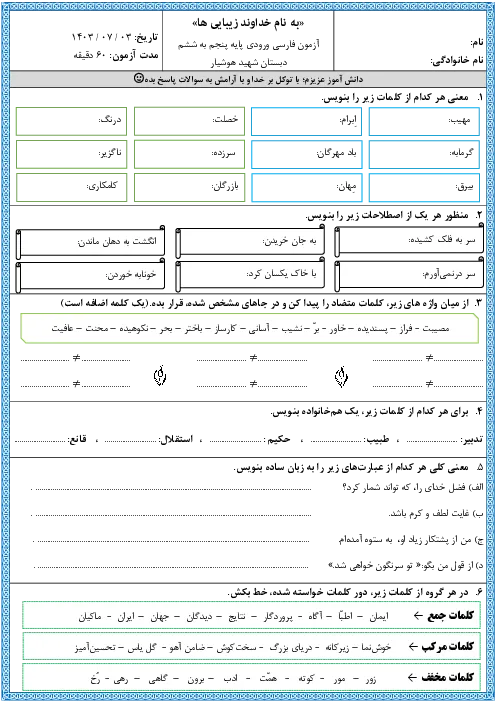 آزمون سنجش ورودی فارسی از پایه پنجم به ششم دبستان شهید هوشیار
