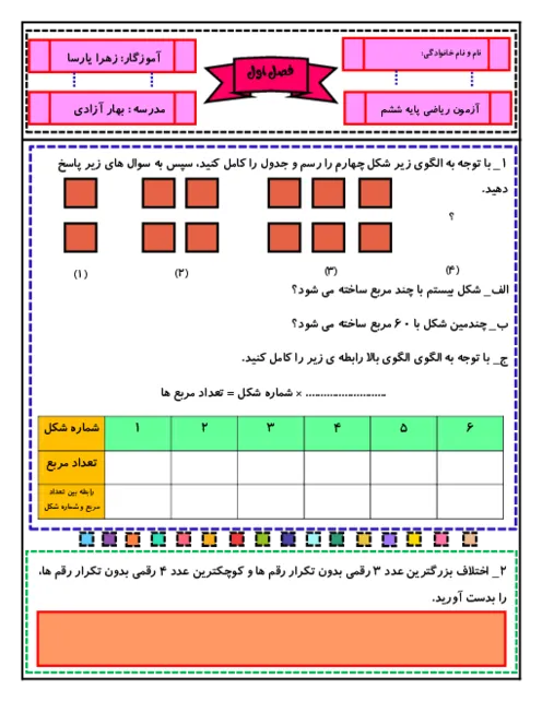 سه سری آزمون فصل اول (عدد و الگوهای عددی) ریاضی پایه ششم دبستان