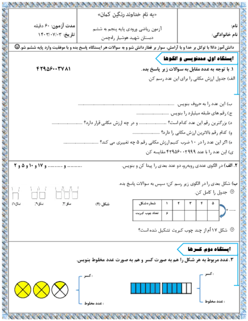 آزمون سنجش ورودی ریاضی از پایه پنجم به ششم دبستان شهید هوشیار