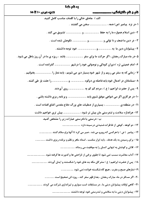 نمونه سوالات امتحانی ارزشیابی مستمر درس 10 تا 15 هدیه های آسمانی ششم دبستان