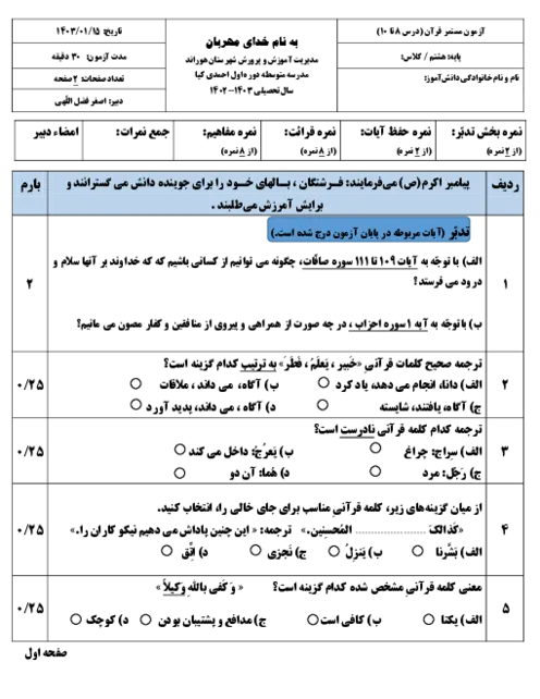 آزمون میان نوبت دوم دروس 8 تا 10 قرآن پایه هشتم دبیرستان احمدی کیا