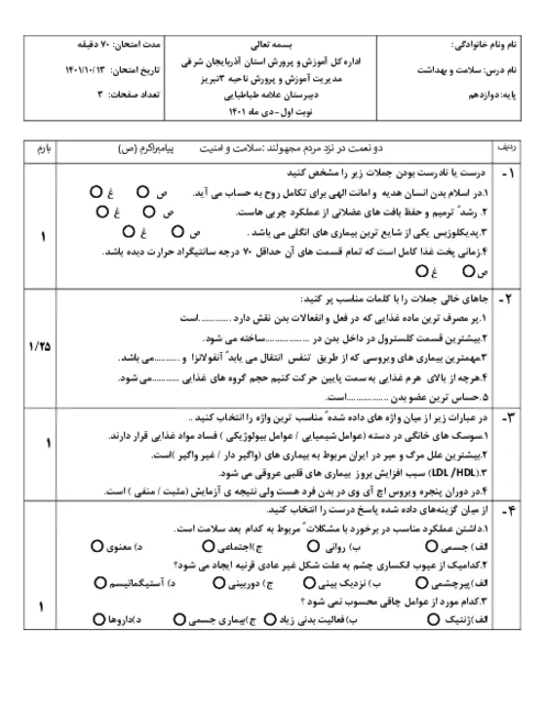 آزمون نوبت اول (درس های 1 تا 7) درس سلامت و بهداشت پایه دوازدهم دی 1401 دبیرستان علامه طباطبایی