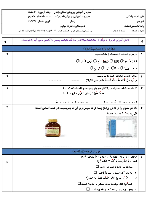سوالات استاندارد عربی هشتم درس6-7 منطبق با بارم بندی جدید با سوالات متنوع