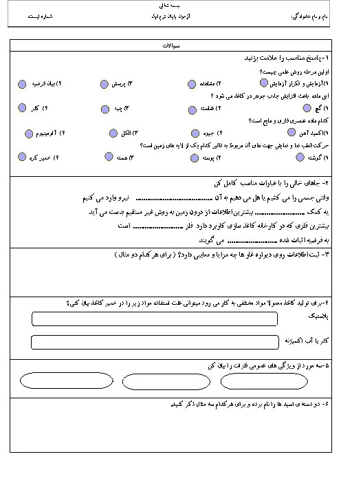 نمونه سوالات امتحانی نوبت اول دروس 1 تا 5 علوم تجربی ششم دبستان