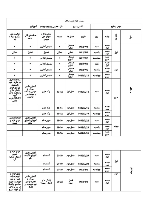 طرح درس و بودجه بندی سالانه علوم تجربی پایه دوم ابتدایی