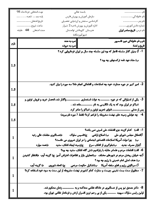 امتحان ترم دوم تاریخ معاصر ایران یازدهم هنرستان کاردانش توانمندان | خرداد 1398