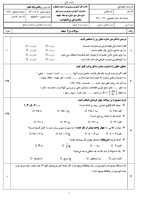 سوالات امتحان نوبت دوم ریاضی هفتم مدرسه شهید شاهمرادی ورنامخواست | خرداد 1401