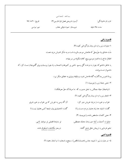 آزمون تشریحی فصل اول فارسی (3) دوازدهم دبیرستان نمونه دولتی عفاف | فصل 1: ادبیات تعلیمی