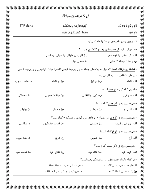 نمونه سوالات امتحانی ارزشیابی مستمر درس 5 تا 8 مدادکاغذی فارسی ششم دبستان