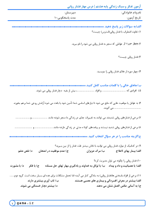 نمونه سوالات امتحانی تفکر و سبک زندگی هشتم مهار فشار روانی همراه با پاسخنامه تشریحی